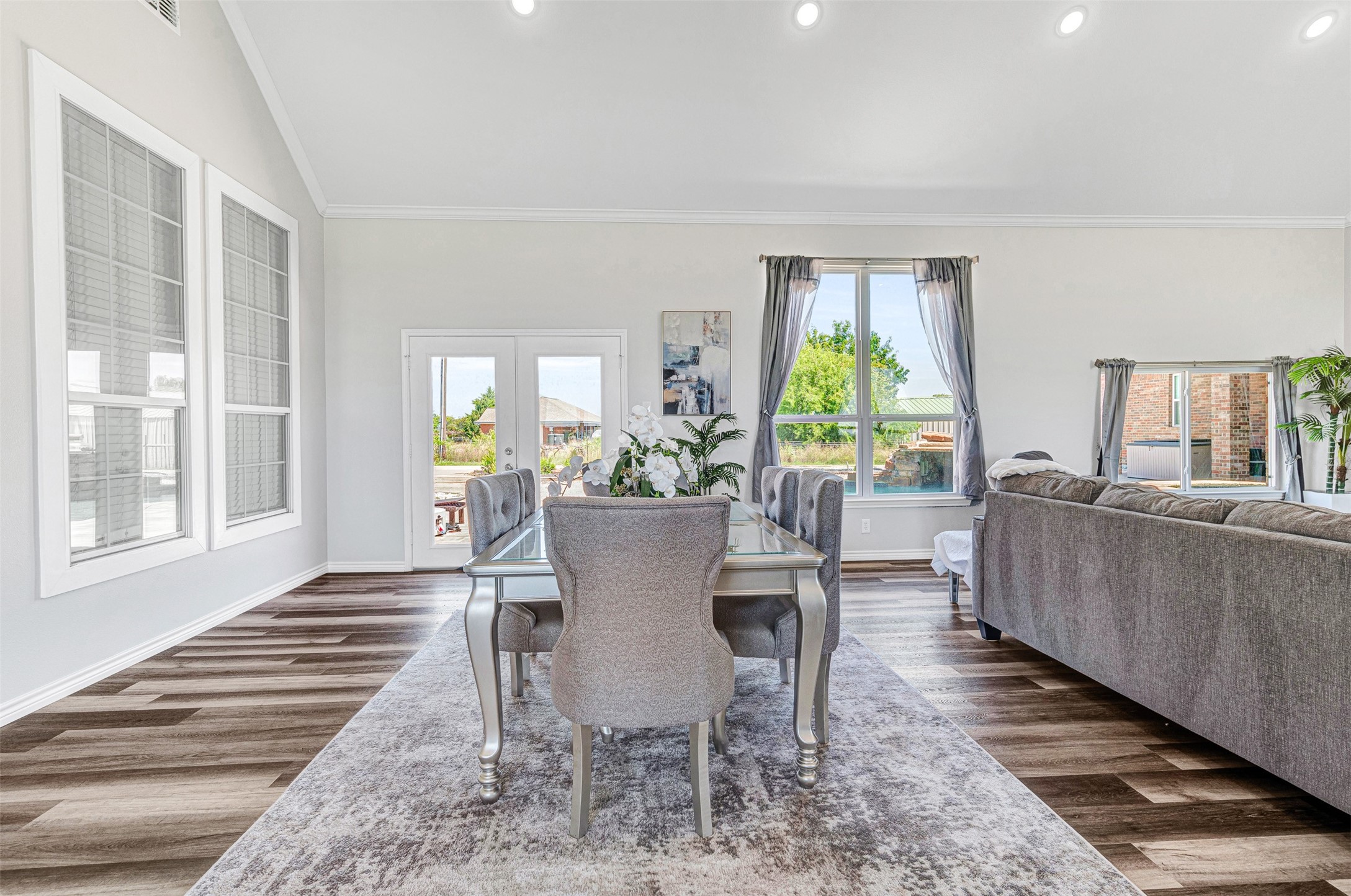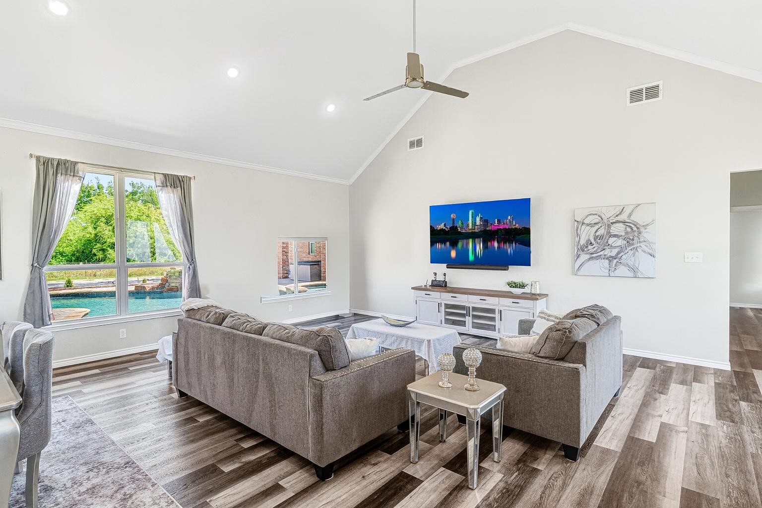 The outdoor environment is built for both relaxation and entertaining, highlighted by a 2023 custom pool and spa with waterfalls, fountains, sun shelf, and dedicated pool bath.