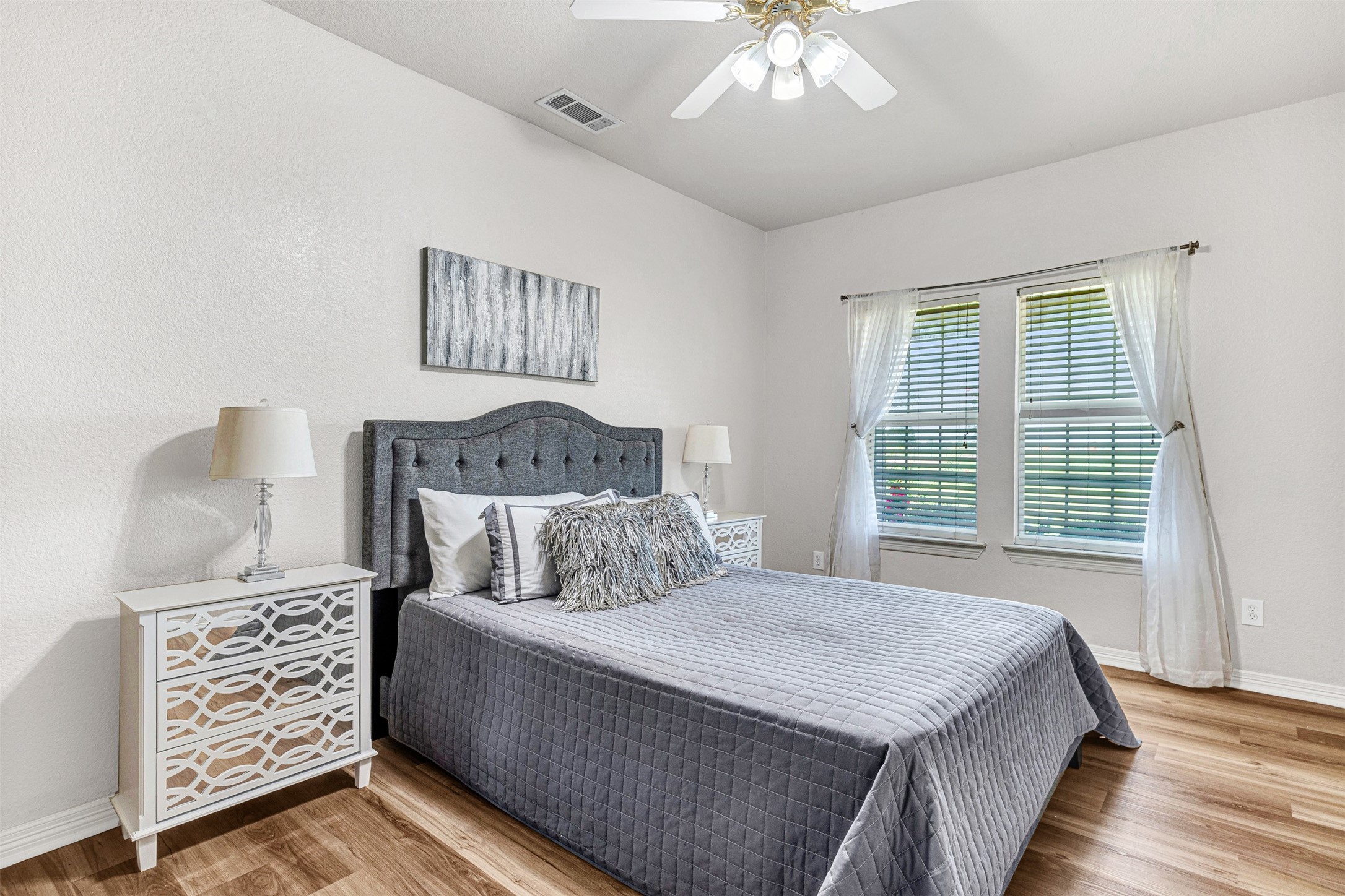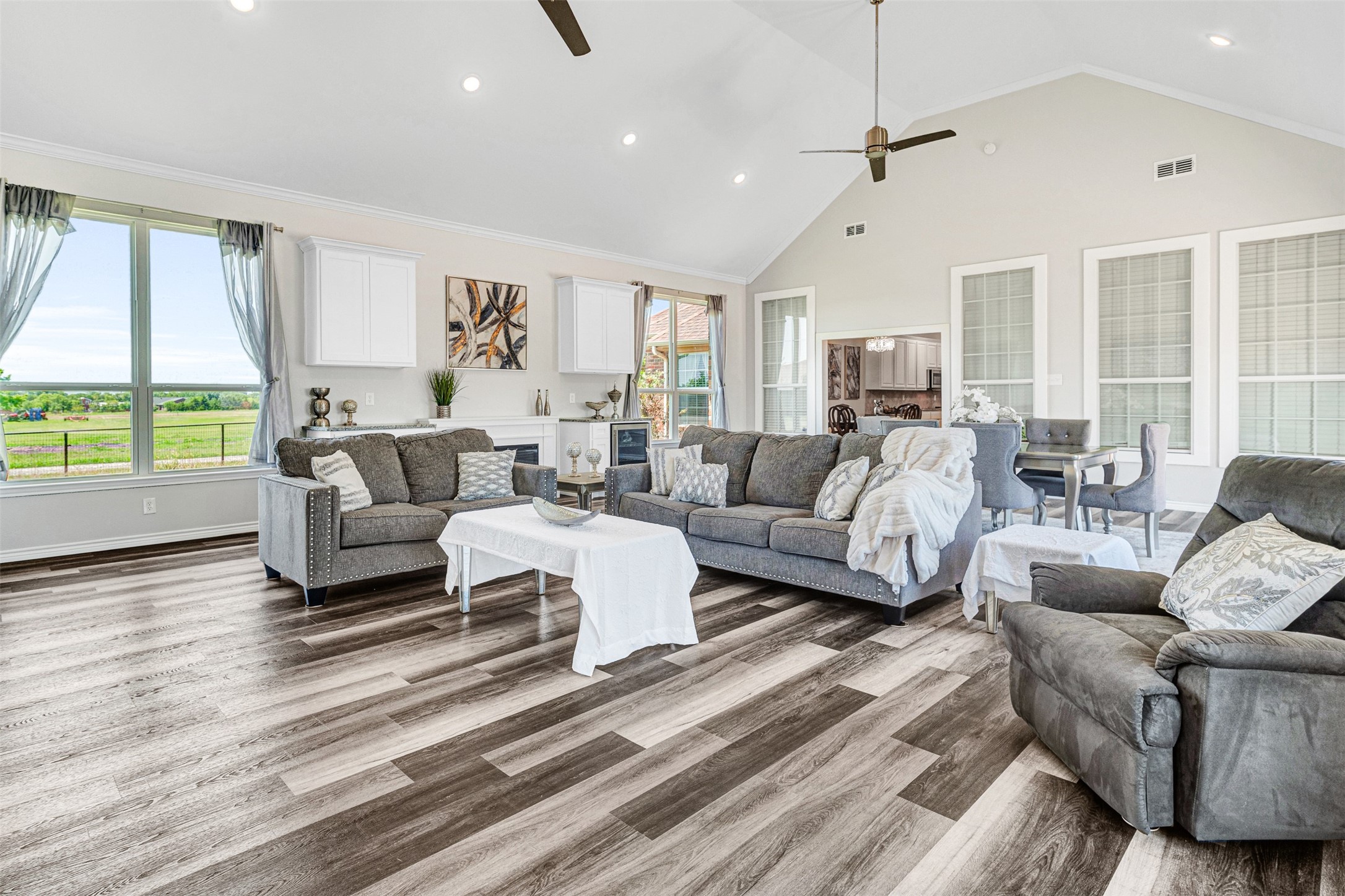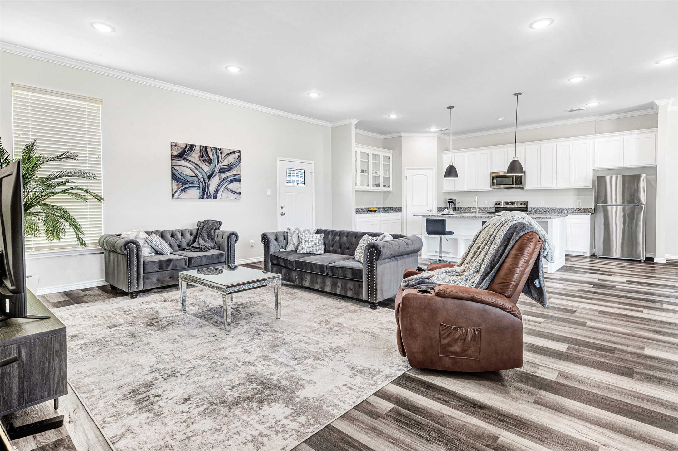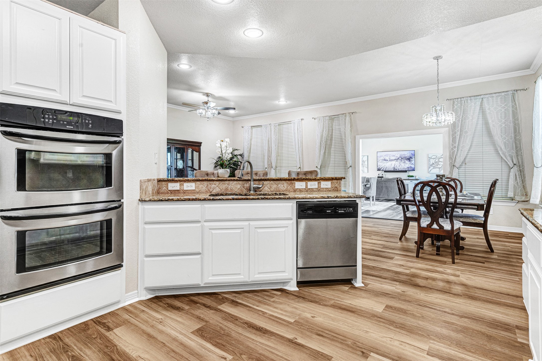 The main residence spans approximately 5,269 square feet and is thoughtfully designed for extended living, featuring five bedrooms, seven bathrooms, three living areas, and two full kitchens. Dual primary suites provide ideal separation and privacy for multiple households. Originally built in 2007 and expanded in 2022, the home has been refreshed with new flooring, paint, and updated trim.